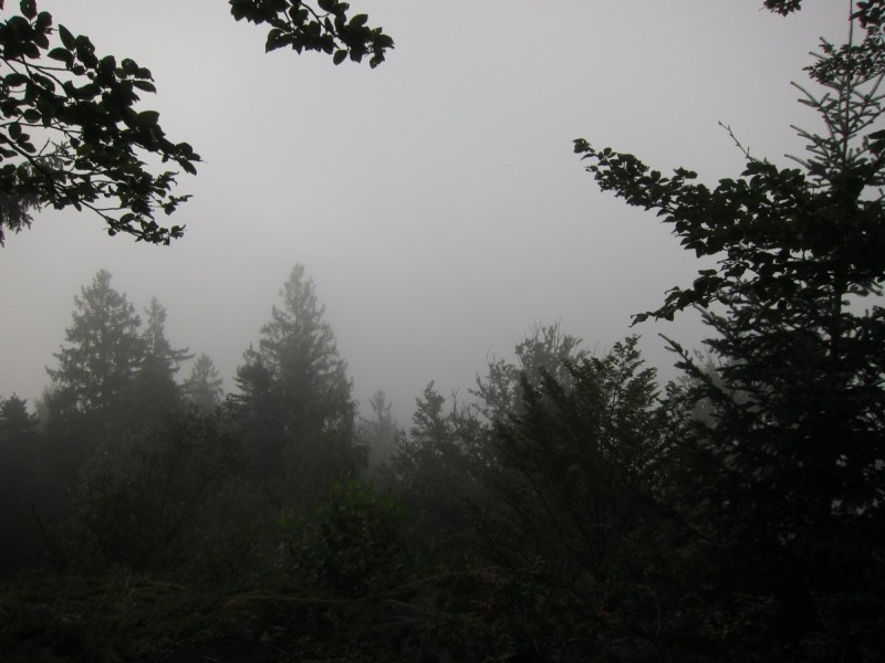 Wenn die hier MTB sagen, dann meinen sie das auch: die Strecken sind interessant. Der vorletzte CP befindet sich auf einem Berggipfel, unser Weg dahin löst sich leider in Gestrüpp auf, aber immerhin liegen da schon zwei weitere Bikes, deren Besitzer uns entgegenstolpern. “Ist da oben der CP?” – “Ja.” – “Kommt man da mit dem Rad rauf?” – “Nein.” Ach. Rad geschultert und hoch das Geröllfeld. Belohnt werden wir mit herrlicher Aussicht… ins Nichts.