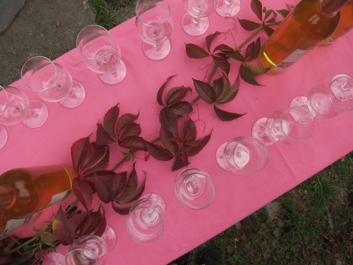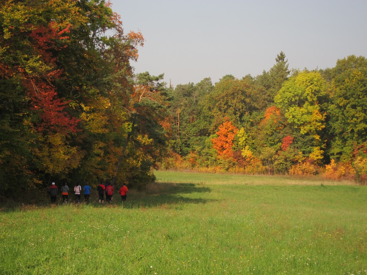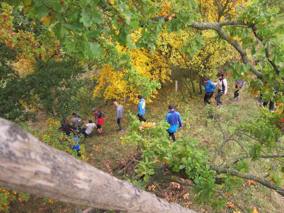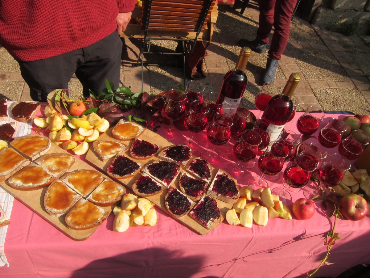 Zum Glück enthielt die Wirklichkeit dann auch deutlich mehr Obstwein als Lauf. Die Veranstaltung begann mit einer gemütlichen Verkostung mit Viergängemenu am Vorabend (Pastaparty? Pah!), und obwohl die Runde noch lange beisammen saß, waren am Samstag Morgen doch alle wieder rechtzeitig wach, um das umfangreiche Frühstück (sechs Sorten selbstgemachte Marmeladen, sag ich nur! Besser geht’s nicht!) zu genießen. Vorm Start wurde dann schon das erste Mal auf gutes Gelingen angestoßen, dann ging’s in sehr gemütlichem Tempo (sogar für verschnupfte Läufer!) knapp 10km zur ersten Verpflegung: Apfelwein, Apfelsaft, Äpfel, Ziegenkäse (und Kastanien – zum Sammeln, nicht zum Essen).
