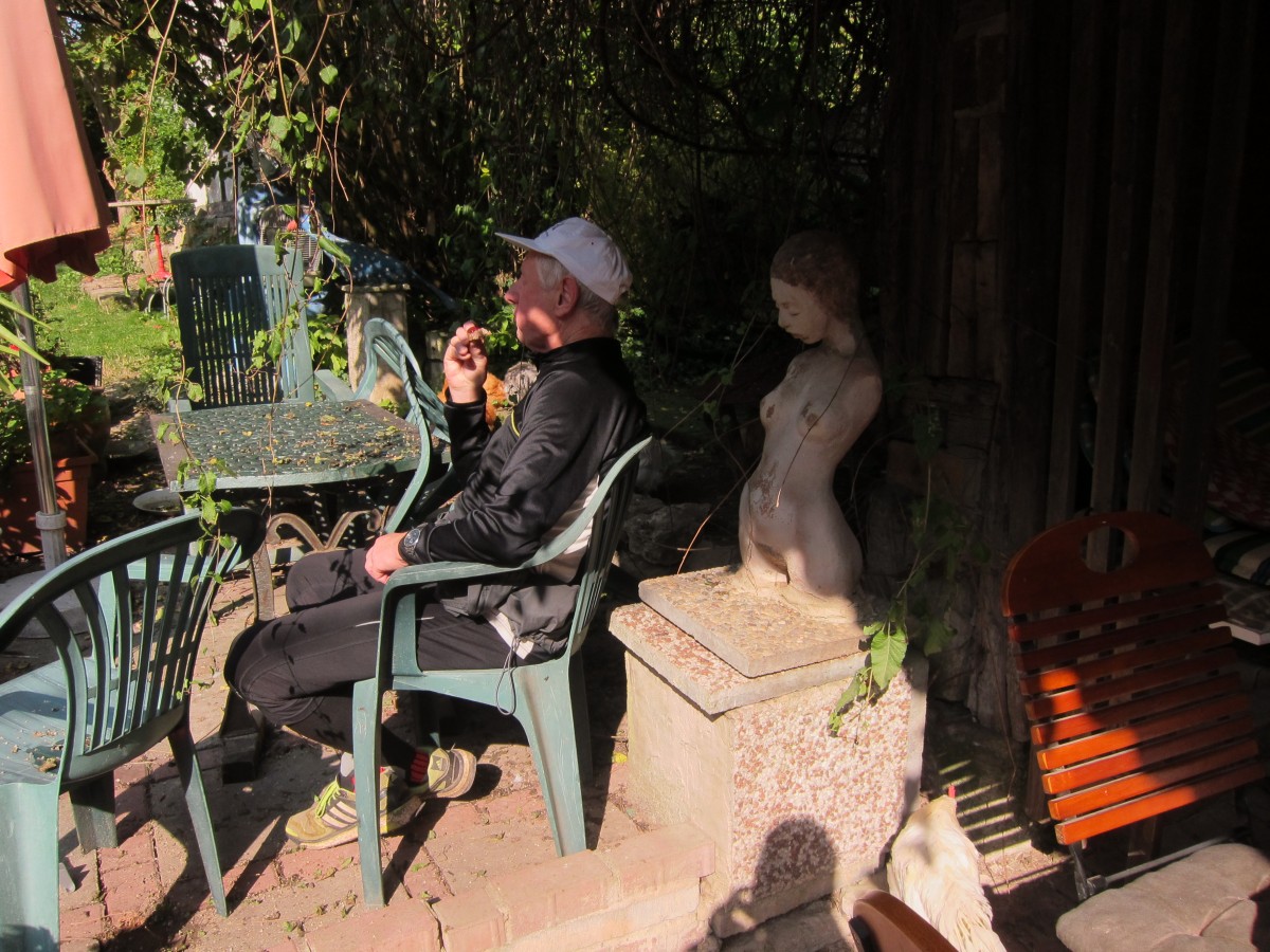 Danach kam sogar die Sonne raus, wir wanderten auf den Berg und auf der Gipfel-Sonnenbank brachen schon die ersten Kandidaten zusammen. Danach noch deutlich gemütlicher weiter – nun wurde sogar schon 1% als “Steigung” deklariert, an der gegangen wurde. Bis zur zweiten Verpflegung in Plinz (Link bitte mit Vorsicht anklicken, man könnte erblinden): Pflaumenwein, Quittensaft, Äpfel, Marmeladenbrote.